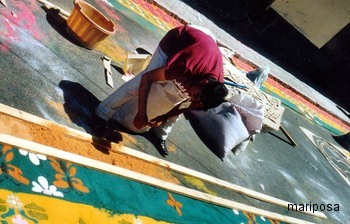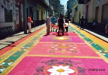 Jetzt ist es fast 8 Uhr Abends und das ist die letzte Nachricht aus Honduras. Nachdem wir den ganzen Tag damit verbracht haben den Menschen zuzusehen wie sie aus buntem Sägemehl, in allen Farben leuchtende, prächtig gemusterte „Teppiche“ auf die Straße zauberten,