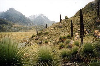 Heute wagten wir uns, gestärkt mit Coca-Tee, wieder auf 5000m zu dem Gletscher „Pastoruri“ und einer Eishöhle. Der Schnee und der Gletscher waren nicht das beeindruckendste des Tages sondern die Fahrt dorthin. Und jetzt fällt es mir etwas schwer, diese faszinierende Öde zu beschreiben. Während wir aus dem Radio melancholische Panflöten hörten, breitet sich vor uns eine durch die hohen Berge begrenzte Ebene aus. Steinig, bewachsen mit Moosen und Gräsern. Pflanzen, die Ähnlichkeit mit Agaven haben, nur viel feinere Blätter und in der Mitte dieser 2m hohen Büschel strebt ein bis zu 10m hoher Blütenstamm in den Himmel. Mineralhaltige, braune Wasserpfützen, Schafe und 2 Alpakas mit Sonnenbrillen.