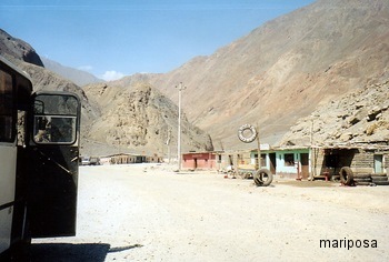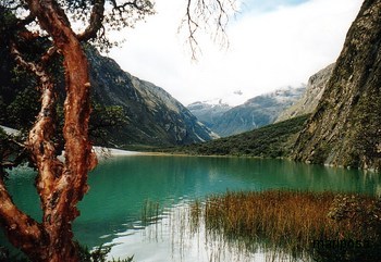 Weiter fuhr unser Bus steil bergan an einzelnen Häusern vorbei bis auf fast 4000m senkrechte Granitwände links und rechts der Piste in Schwindel erregende Höhe emporragten und wir an einer smaragdgrünen Lagune standen, an deren Ende ein schneebedeckter Gipfel zu sehen war.