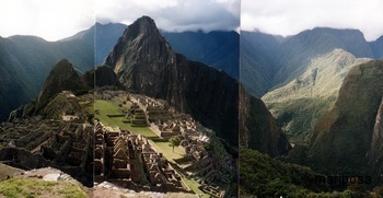 Eine vollkommen erhaltene, weil von den Spaniern nie entdeckte Stadt liegt vor unseren Füßen. Auf dem schmalen Bergrücken drängeln sich Häuser, Tempel, Stufen, Wiesen und die einzig übrig gebliebene Sonnenuhr. Terrassenfelder, die sich rechts und links der Stadt über die Bergflanken hinunterzustürzen scheinen. Vor uns begrenzt die Stadt der wunderschöne, von Bildern her sicher allen bekannte Kegelberg, Huayana Picchu.