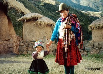Wir beginnen unsere Reise nach Machu Picchu mit einer (ca. 3 stündigen) Busfahrt durch das Hochland Perus. Verstreute Ansiedlungen bilden kleine, urbane Inseln in der Weite der Weizen- und Gerstenfelder. Frauen mit ausladenden Röcken, treiben Schafe oder Ziegen auf die Weideflächen. 2 lange, schwarze, geflochtene Zöpfe, gekrönt von dem viel zu kleinen Melonenhut, baumeln über den Rücken, in den, eingehüllt in ein bunt gestreiftes Tuch, ein ziemlich zerrupftes und dreckiges Kind schläft. Die Haut der Menschen ist dunkel gegerbt und rotfleckig von der intensiven Hochlandsonne.