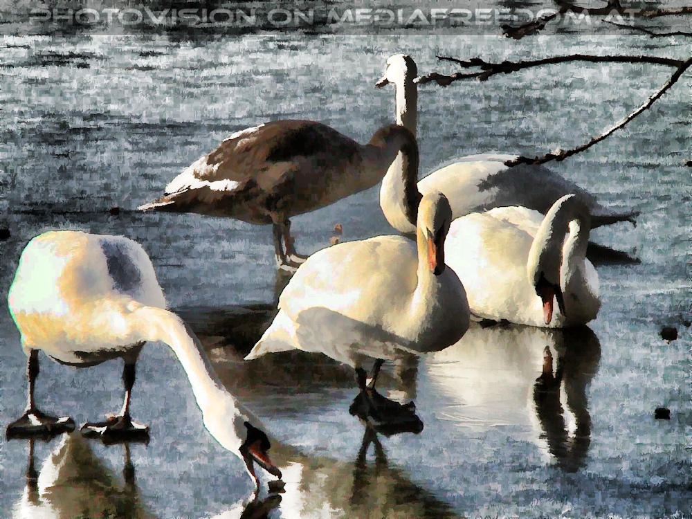 Schwäne picken Futter auf Eis - Alte Donau