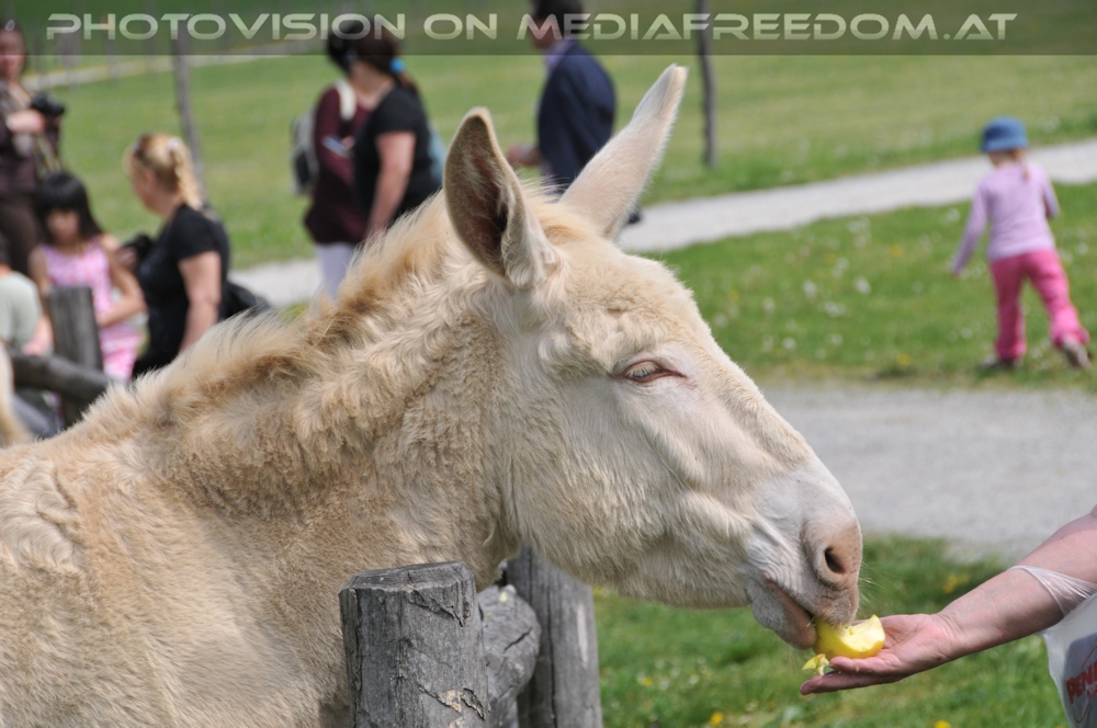 Weißer Esel mit Apfel gefüttert - Schloss Hof (Historisches Maifest)