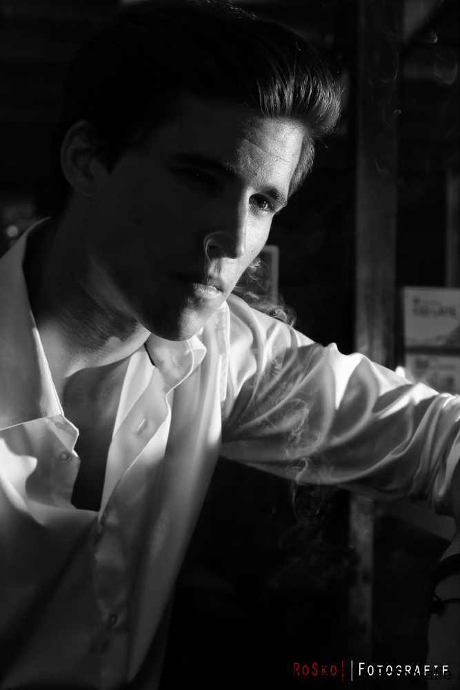 Portraitfoto eines dunkelhaarigen, jungen Mannes der rauchend in einer Bar sitzt. Schwarz/weiß Fotografie.