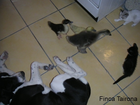 Freundschaft zwischen Hund und Katze und Küken, Gans und Enten